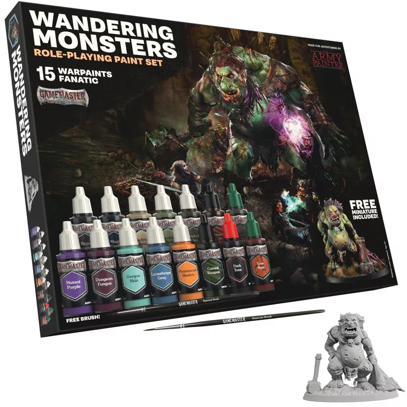 The GameMaster: Wandering Monsters Role-Playing Paint Set includes 15 paints, consisting of 10 vibrant colours, 2 Effect paints, 2 Metallics, and 1 versatile Wash - all specially selected to go with the Wandering Monsters theme. You also get a Painting Guide, a GameMaster Basecoat Brush, and a snap-fit troll miniature – FREE!
