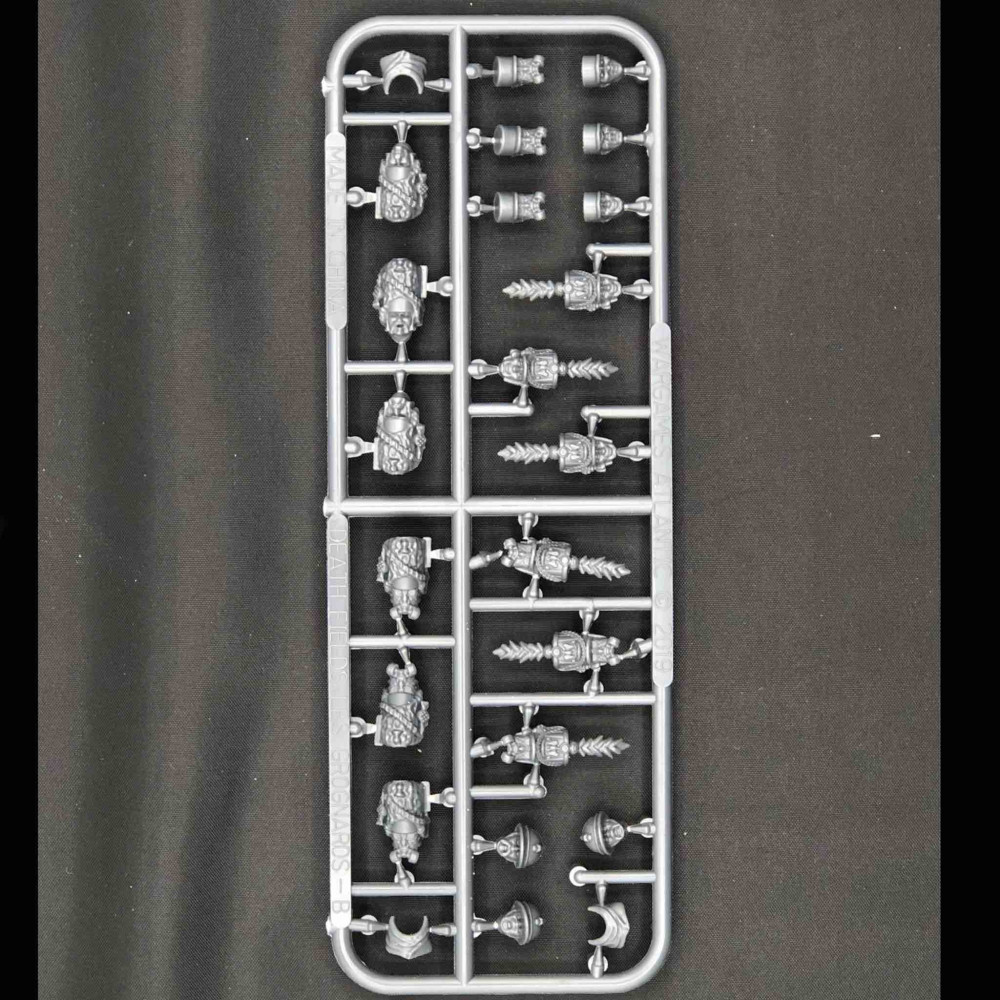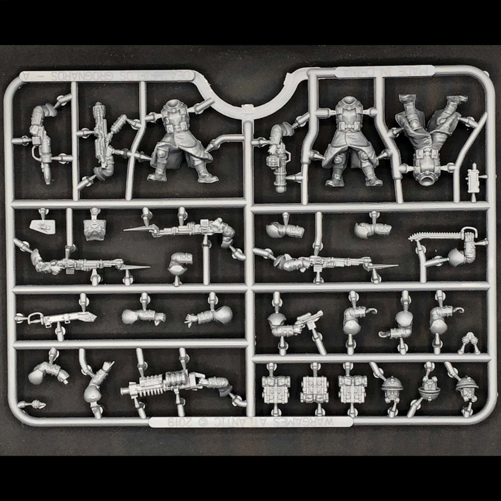 This box set includes enough parts to build 24 heroic scale 28mm figures with a variety of options including standard rifles, heavy lasers, flamethrowers, pistols, swords, heavy plasma guns, communication packs, and grenades. There are also four unique head types with and without gas-masks (192 total heads in this box)s.
