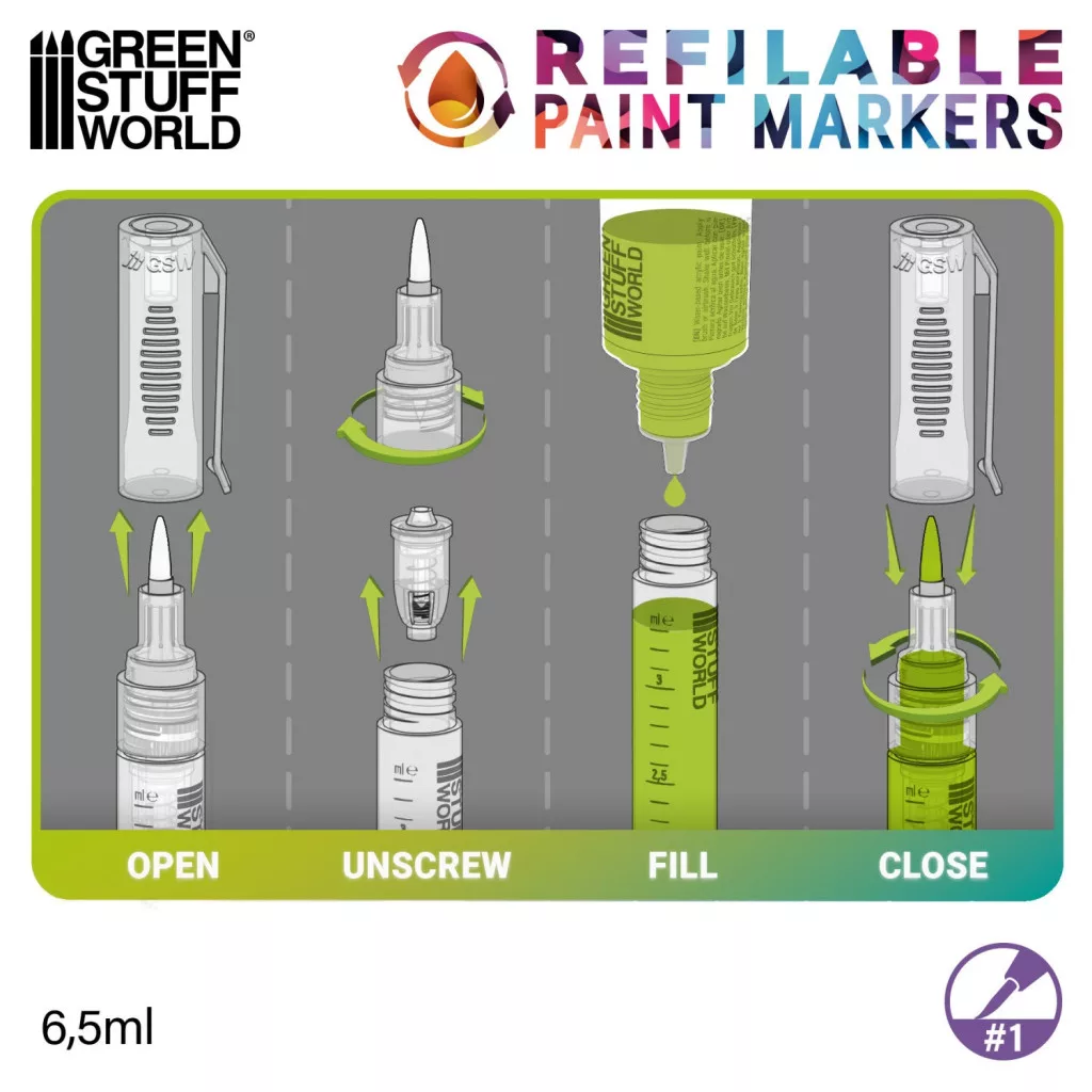 Green Stuff World refillable markers offer an innovative and practical way to apply different types of paint to your miniatures, as well as modeling, art, and craft projects. Their felt fine tips are compatible with a wide variety of products, from model paint and metallic paints, alcohol inks, chrome paints, and even oil paints, making them a versatile tool for any miniature painter, comic book artist, or even illustrator.